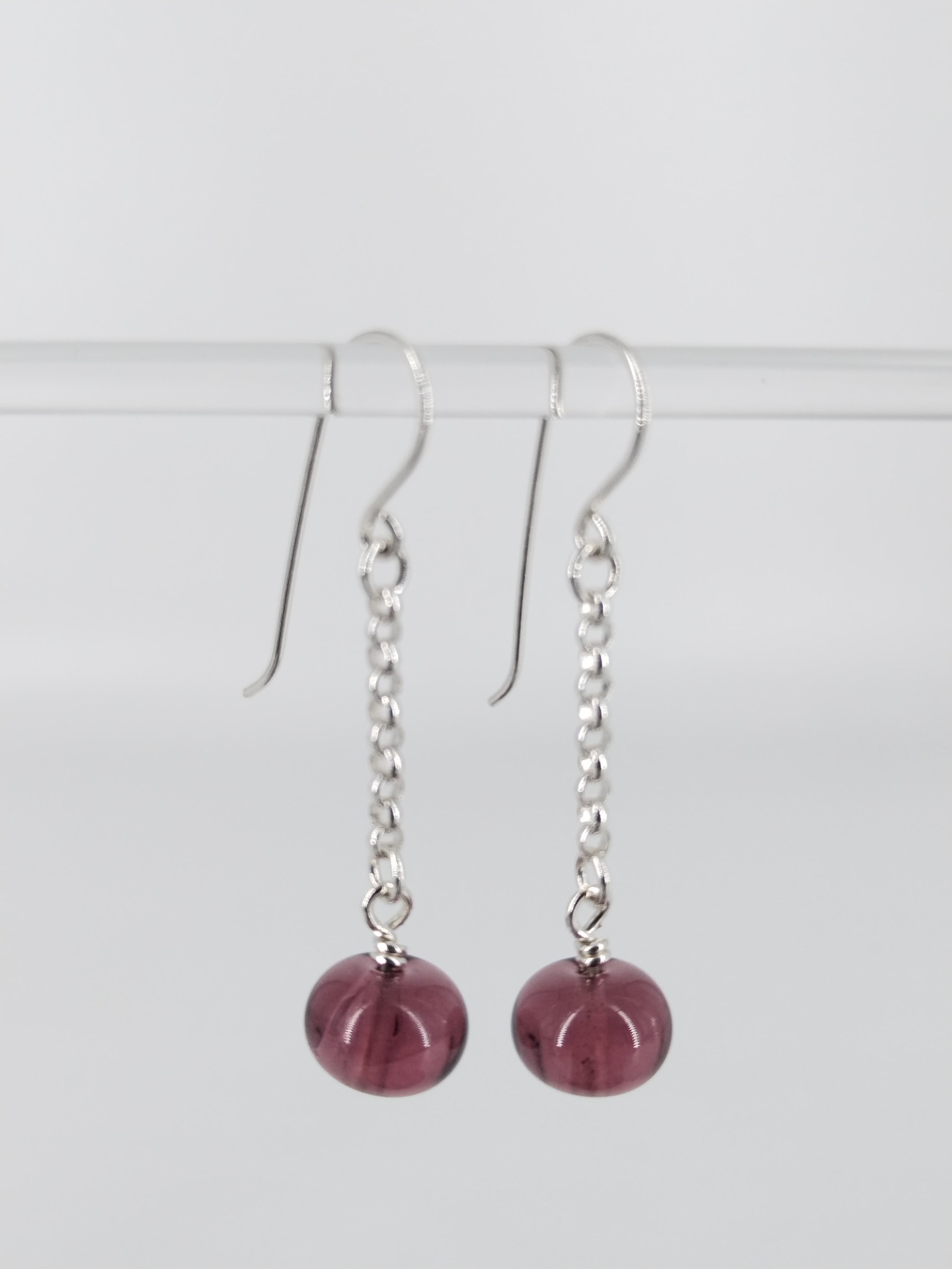 Purppuran sävyinen meri – lämmin, pehmeä ja syvä. Näiden korvakorujen lasi on kuin iltataivaan viimeinen hehku ennen pimeää: rauhallinen mutta voimakas.