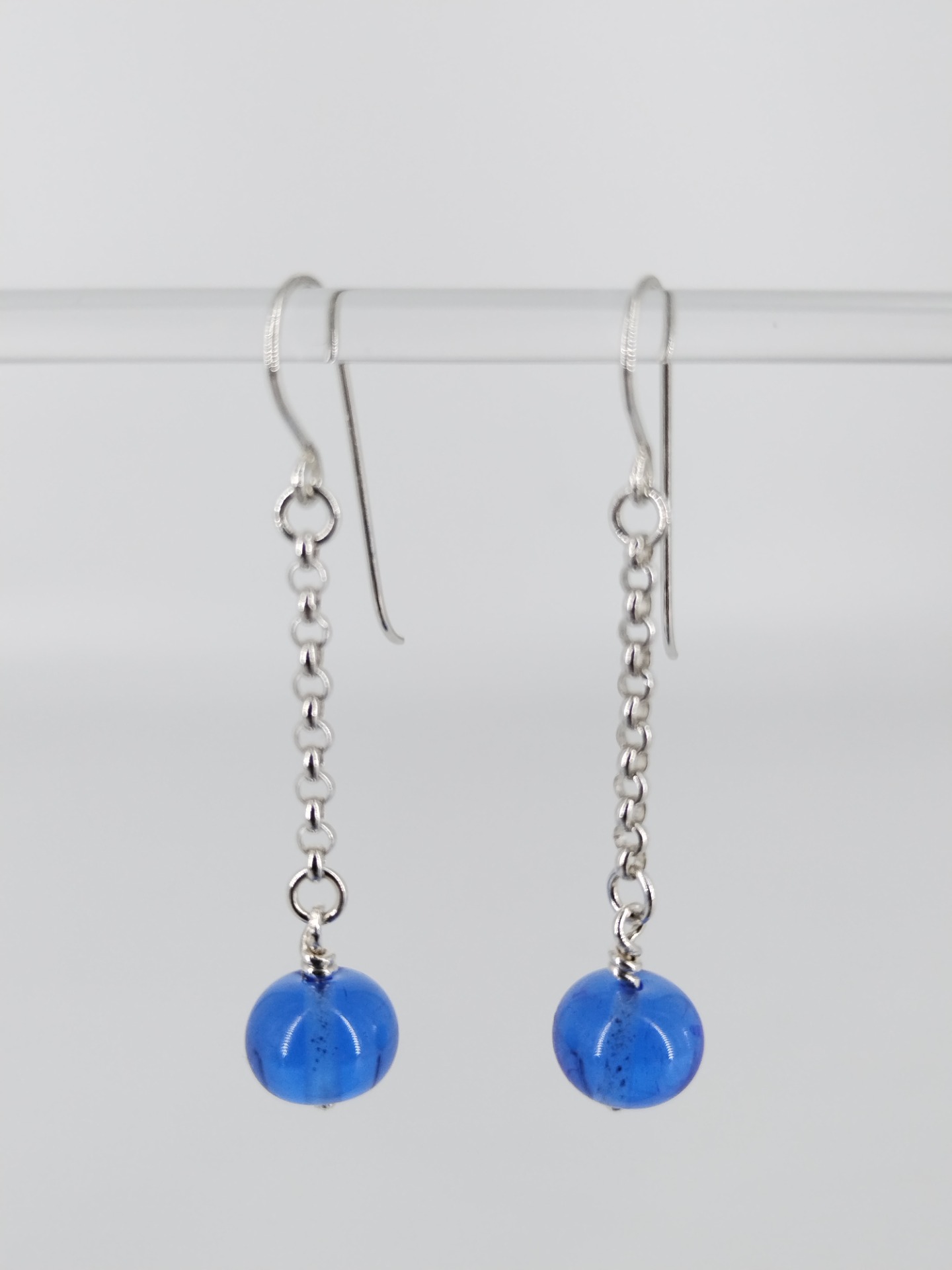 Syvänsiniset lasihelmet veivät ajatukset heti meren syvyyksiin – sieltä ajatus tähän koruun sai alkunsa. Jokainen helmi on sulatettu käsin, ja sen sisään on jäänyt pieni häivähdys valoa, kuin aaltojen väliin kätketty hehku.
