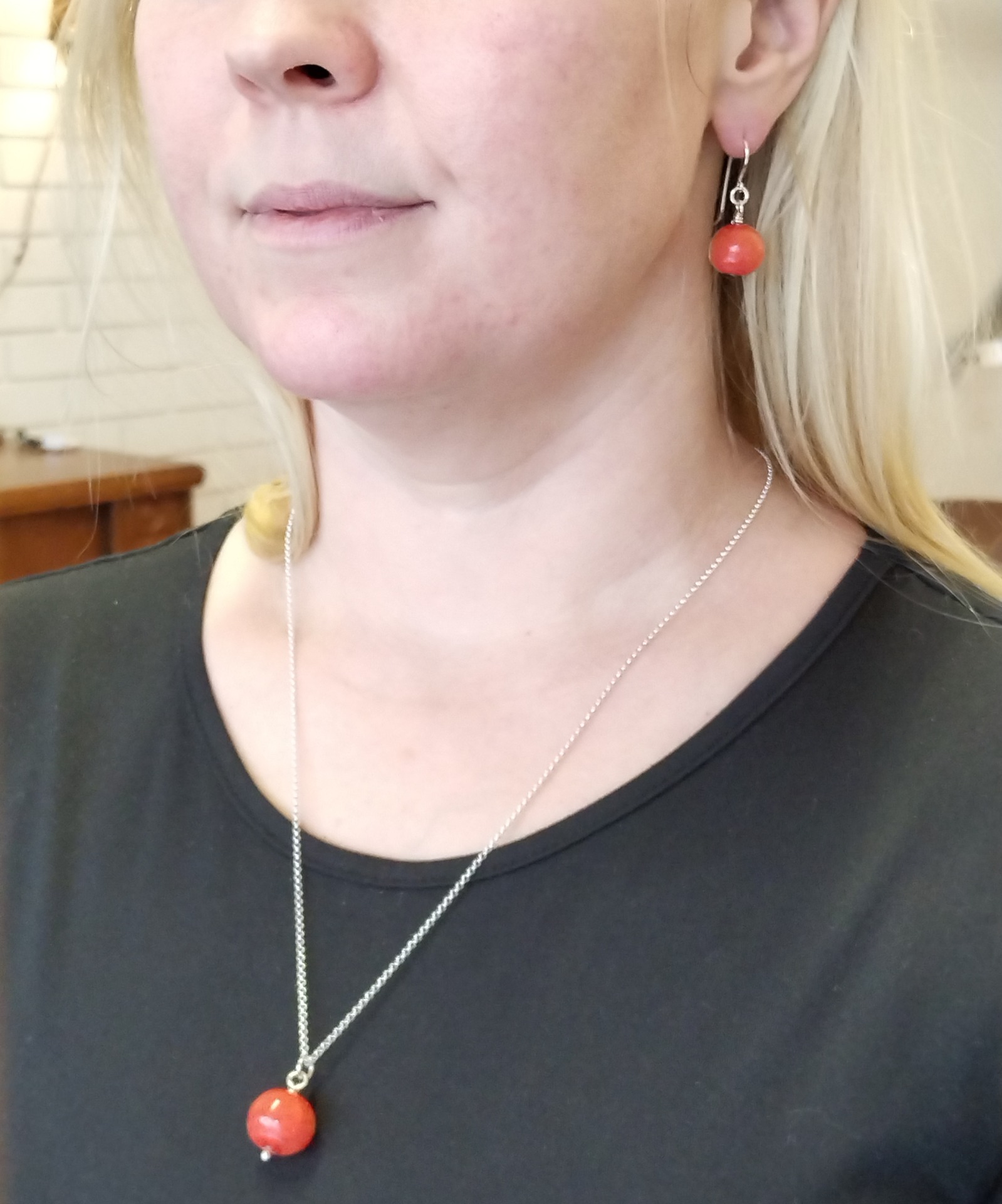 Ilon värit syntyi asiakkaan toiveesta. Asiakkaan, joka nauravin silmin osui myyntipöytäni luokse ja toivoi näkevänsä kirkkaan keltaiset korvakorut. Sellaisia ei löytynyt valmiina, joten päätin tehdä hänelle tilaustyönä sellaiset. Ihastuin itsekin positiiviseen ja lämminhenkiseen väriin ja päätin luoda siitä kokonaisen korusarjan.