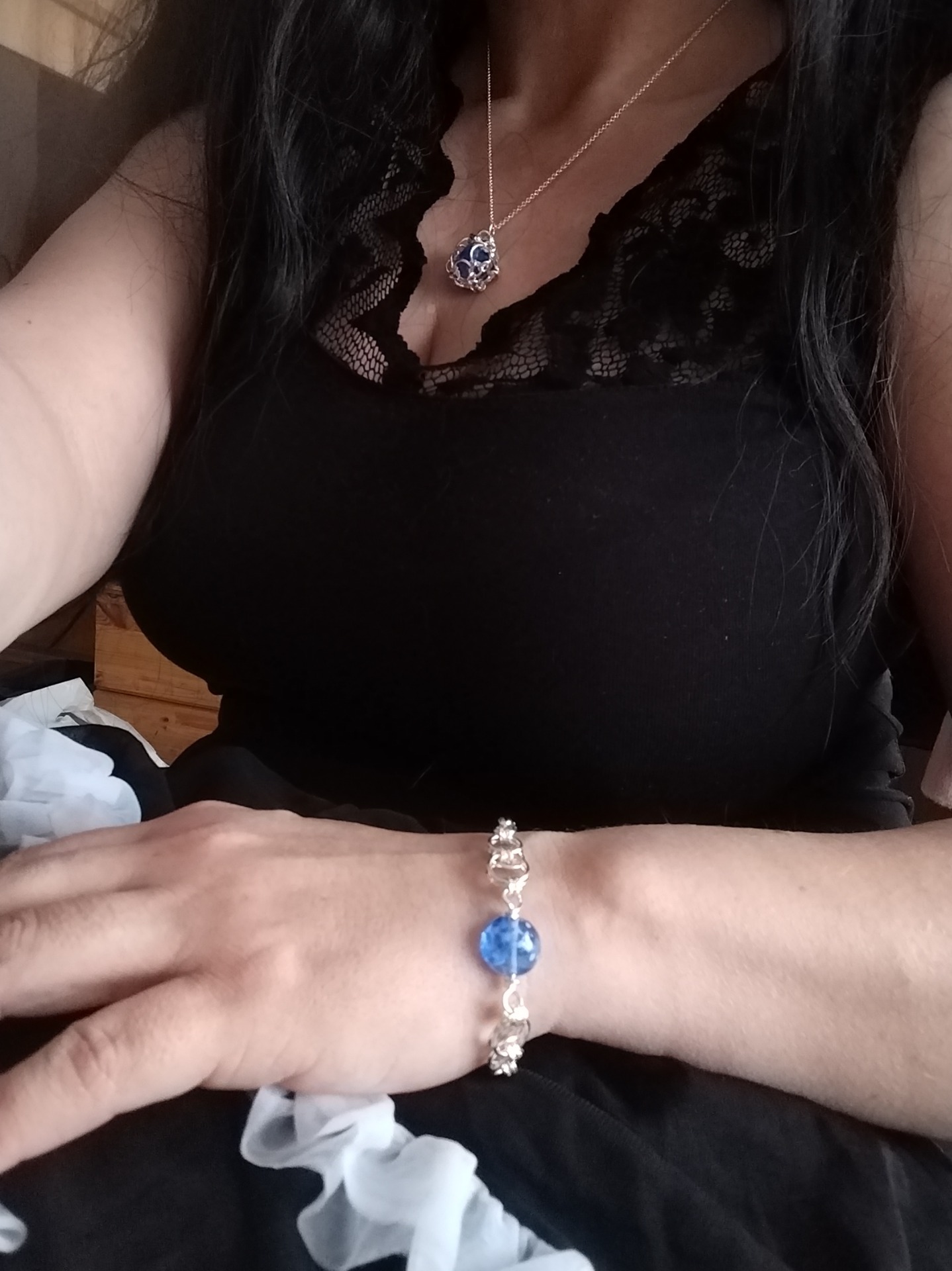 Jotain sinistä -ranneketju on elegantti ja ajaton koru, joka tuo hienovaraisen sinisen yksityiskohdan morsiamen asuun. Hopeinen ketju ja käsin yhdistellyt lenkit kehystävät pehmeästi hohtavaa sinistä lasihelmeä, luoden rauhallisen ja tasapainoisen kokonaisuuden.