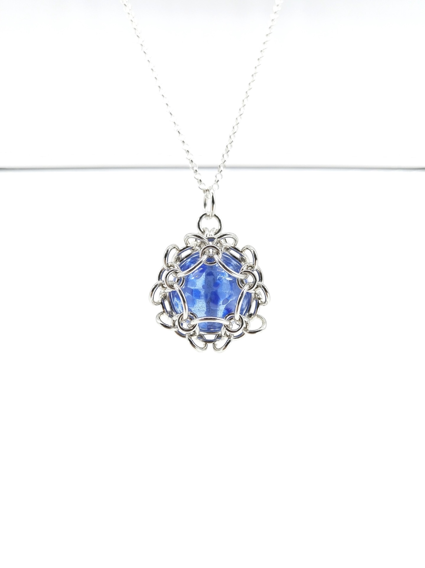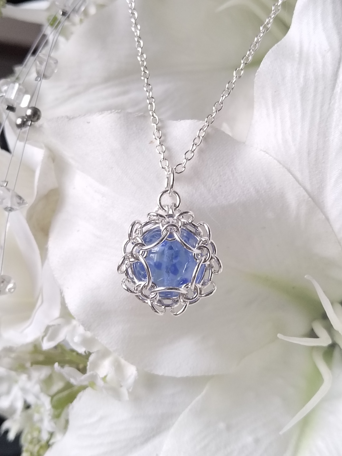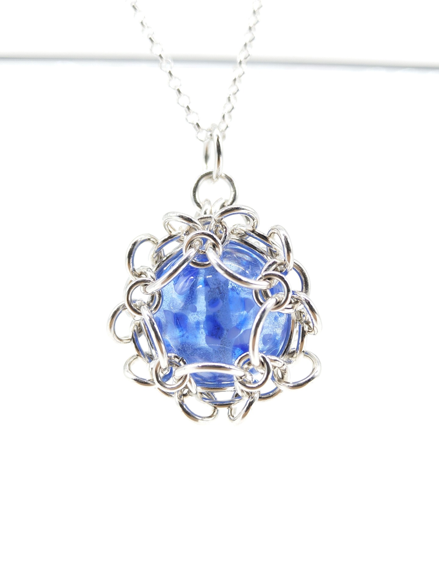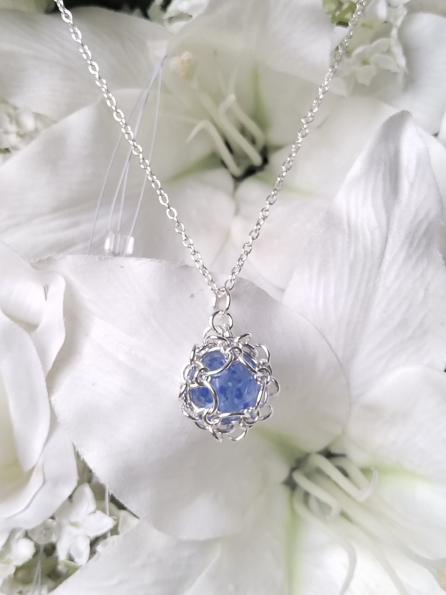 Materiaalit: Hopeaa ja käsin muotoiltua lasia. 50 cm pitkän ketjun kanssa.