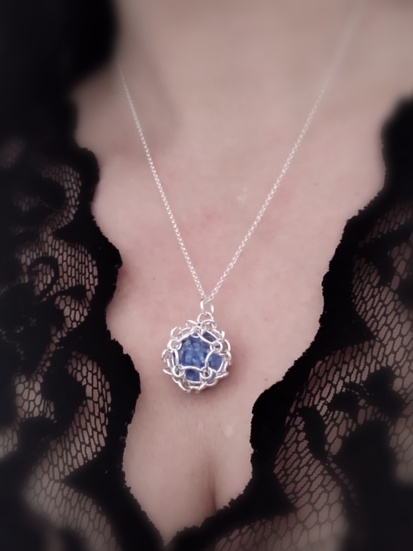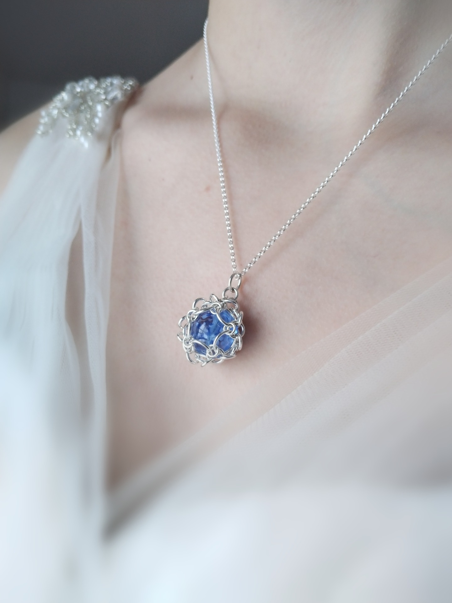 Jotain sinistä - riipus on näyttävä mutta hienostunut koru, jossa perinne kohtaa ajattoman muotokielen. Hopeisista lenkeistä käsityönä valmistettu riipus kätkee sisäänsä ainutlaatuisen käsin sulatetun ja muotoillun lasihelmen, jonka lempeä hohde tuo koruun syvyyttä ja merkitystä.