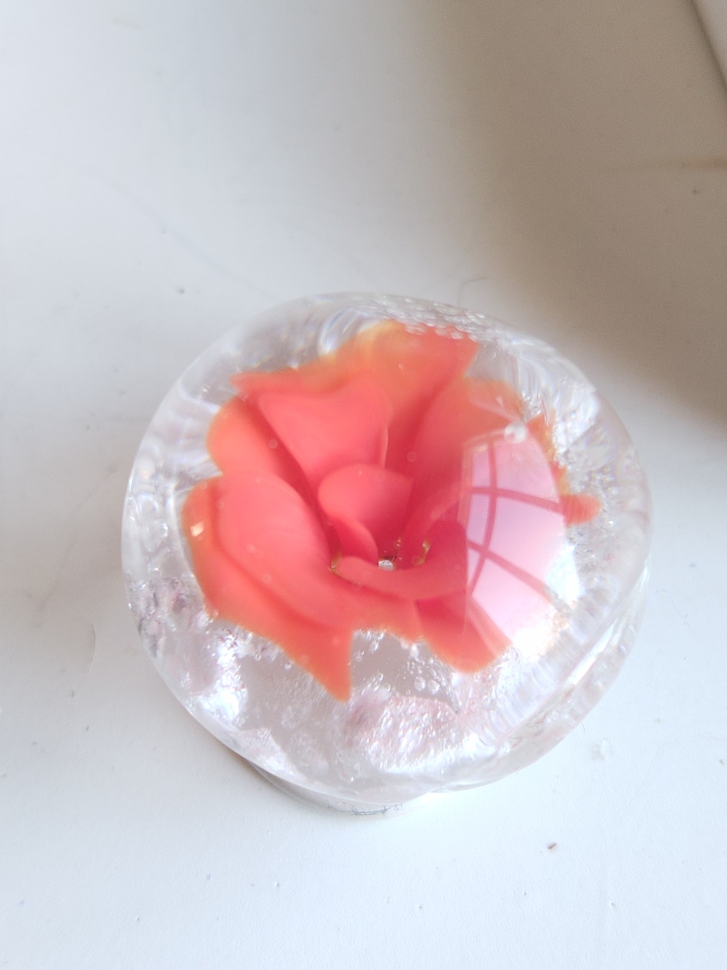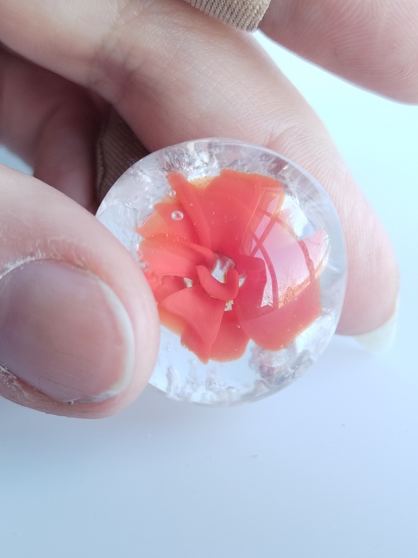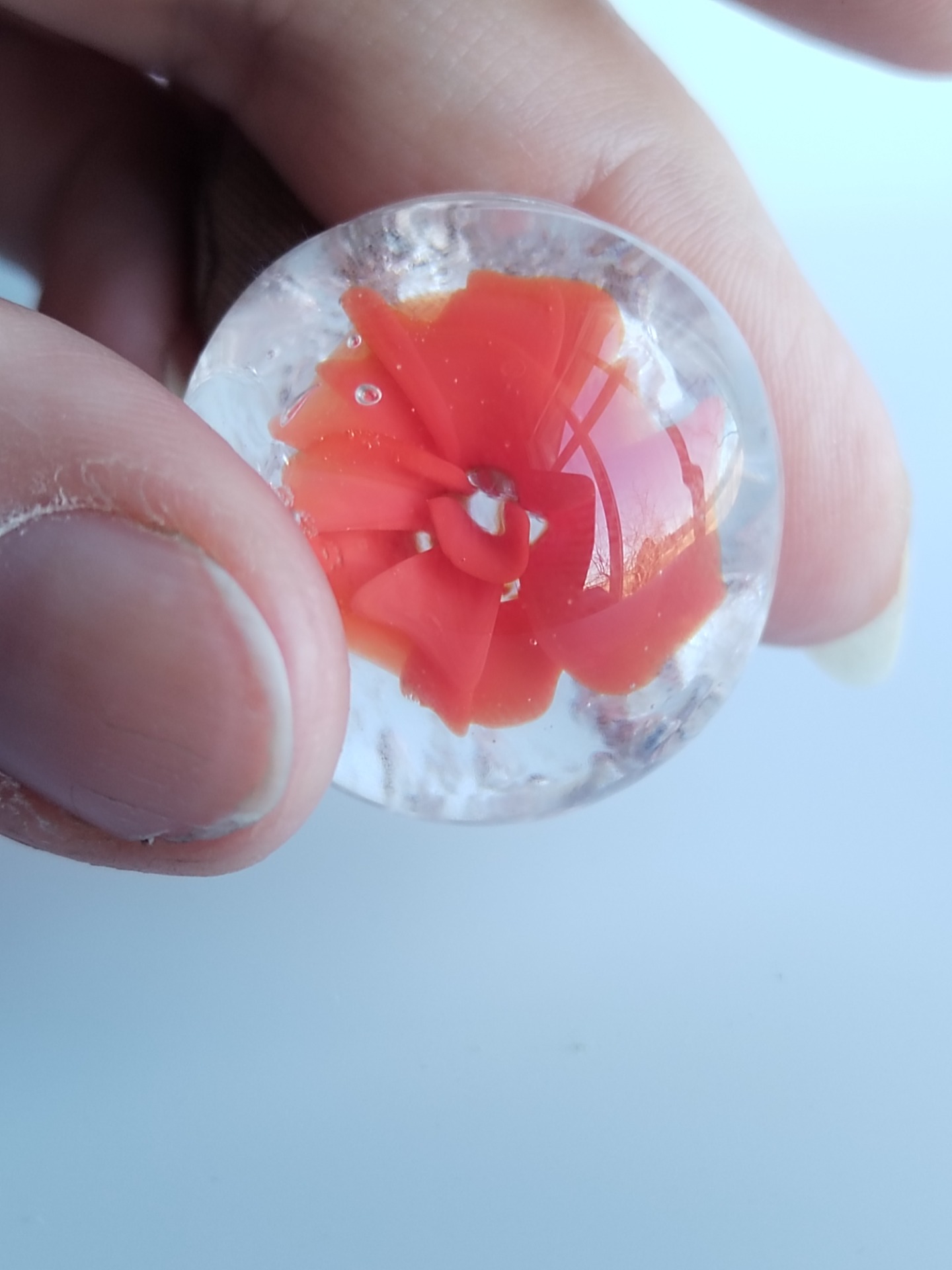 Käsintehty lasinen muistopallo jonka sisään sulatettu lasinen kukka lepää lemmikin tuhkan päällä.