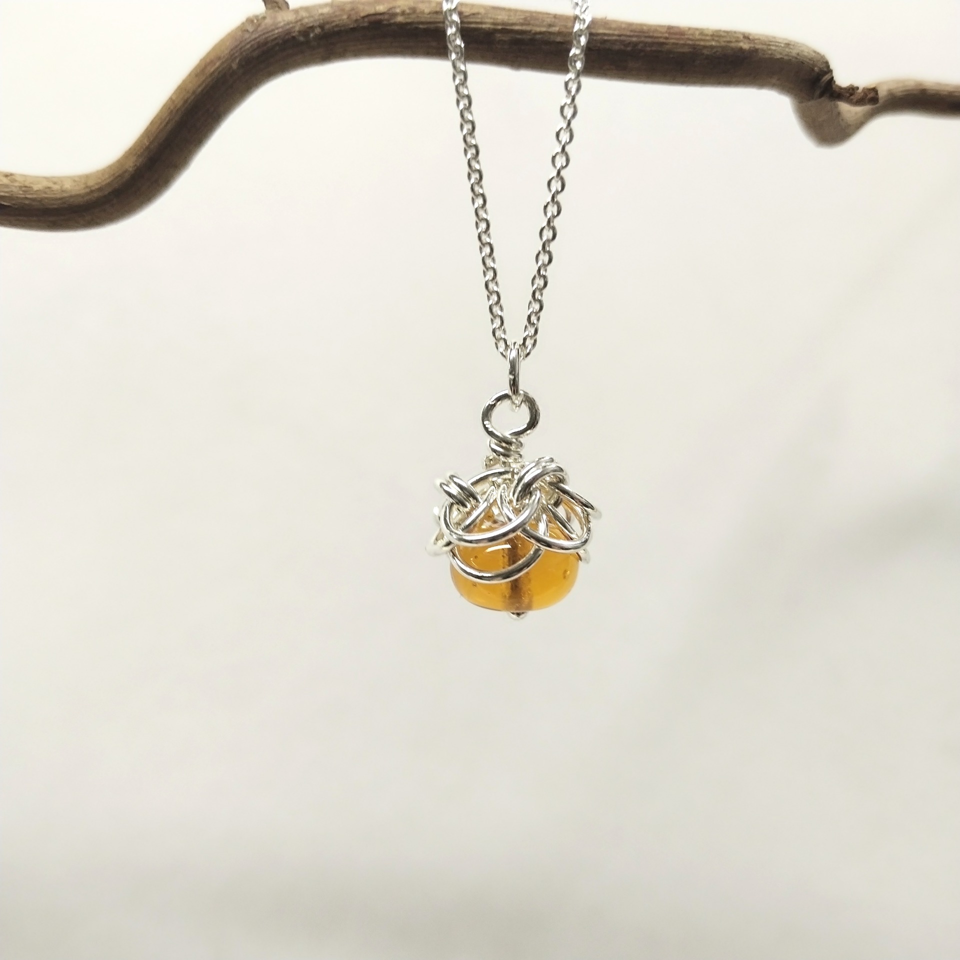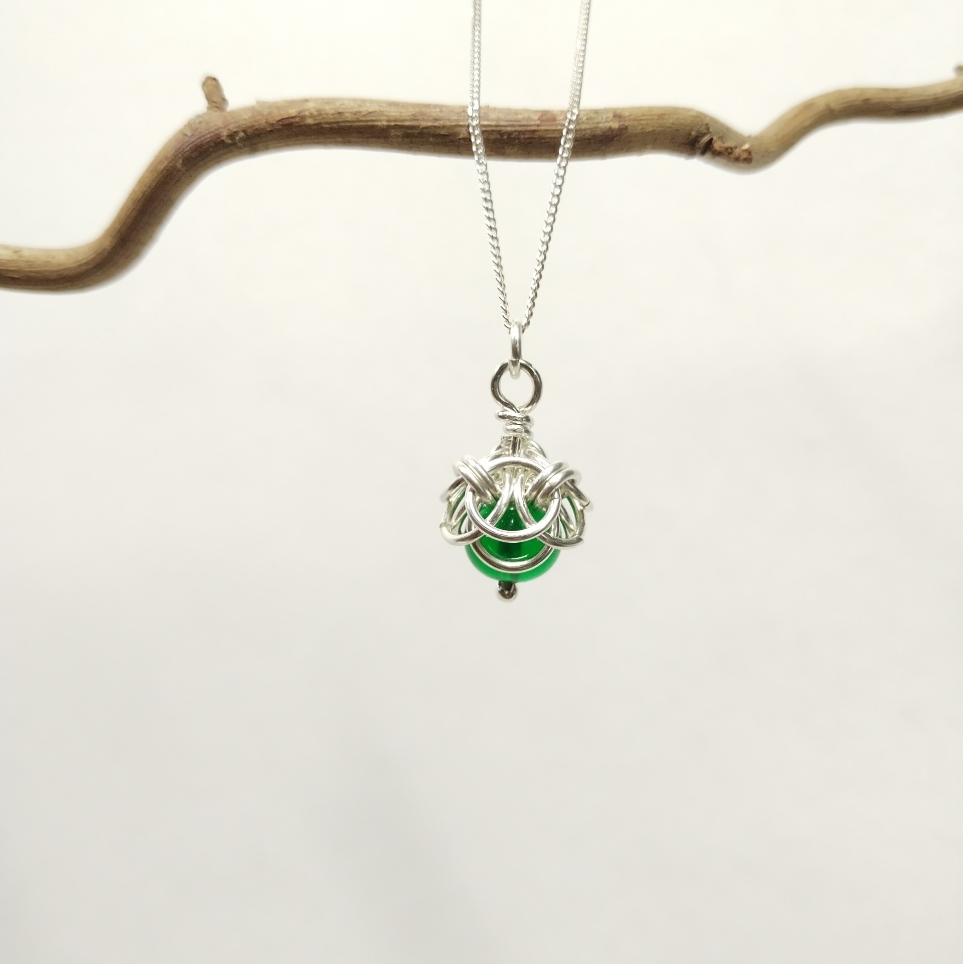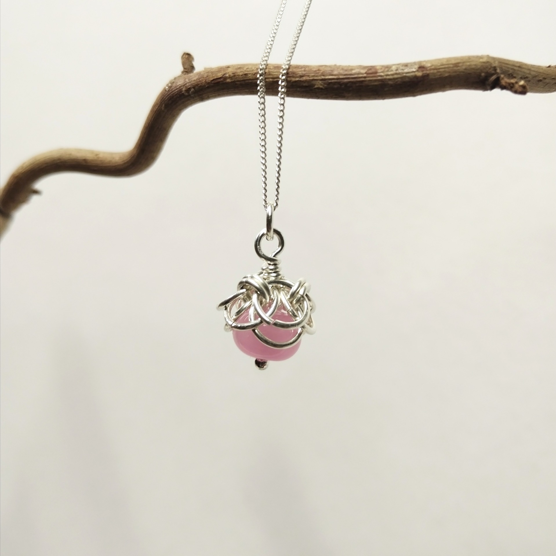 Herkkä pienikokoinen riipus on valmistettu hopeisista lankalenkeistä, jotka muodostavat suojaavan kehyksen käsin muotoillulle lasihelmelle.