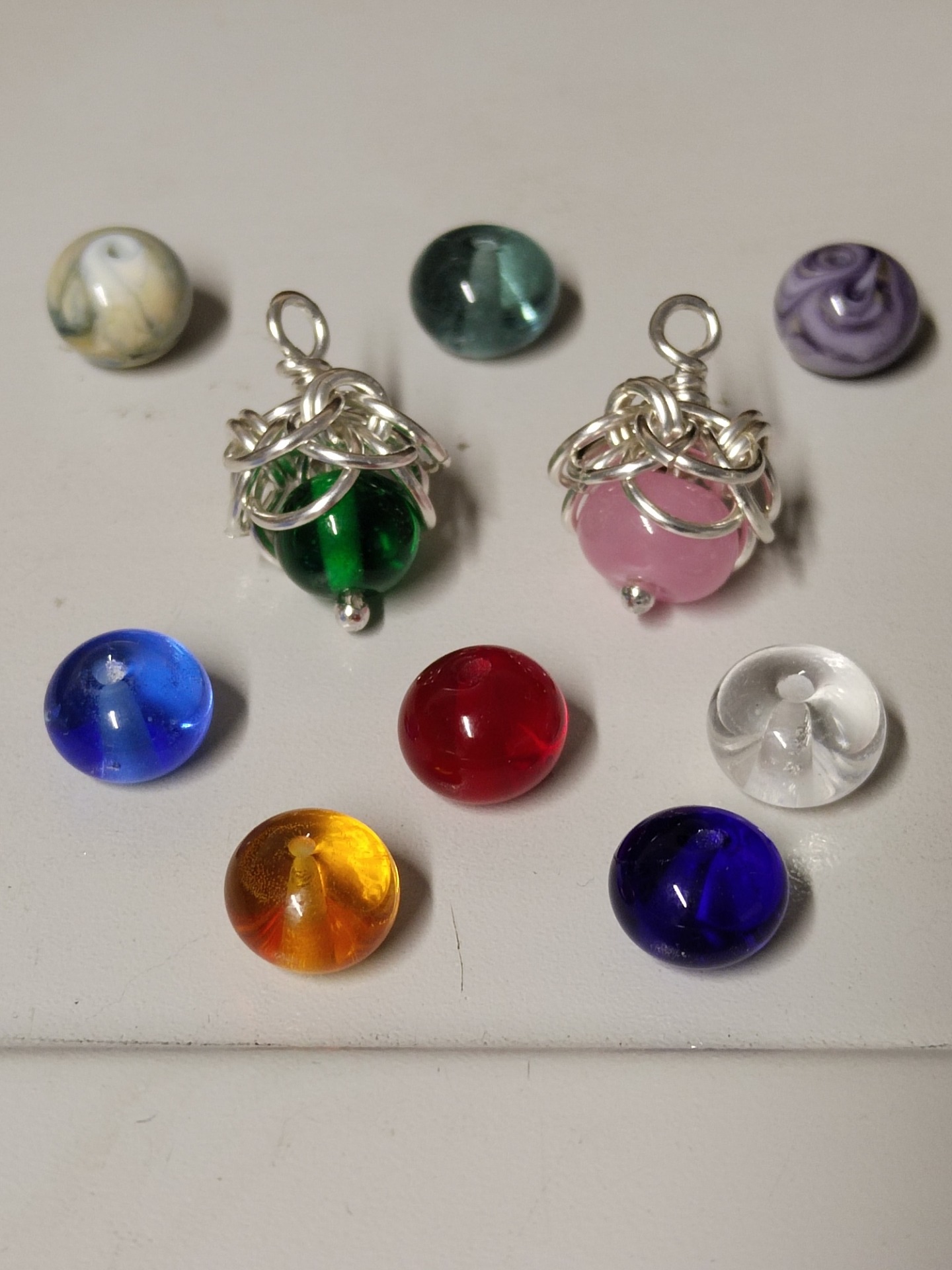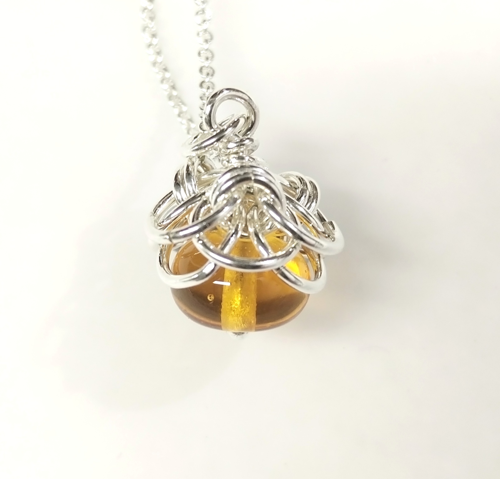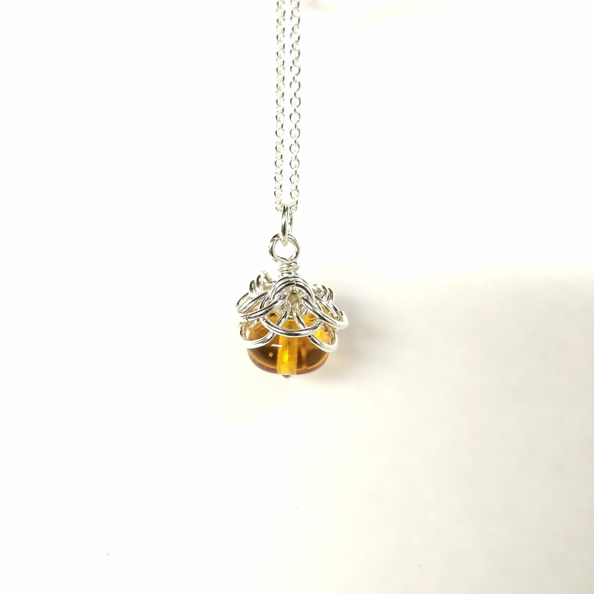 Herkkä pienikokoinen riipus on valmistettu hopeisista lankalenkeistä, jotka muodostavat suojaavan kehyksen käsin muotoillulle lasihelmelle.
