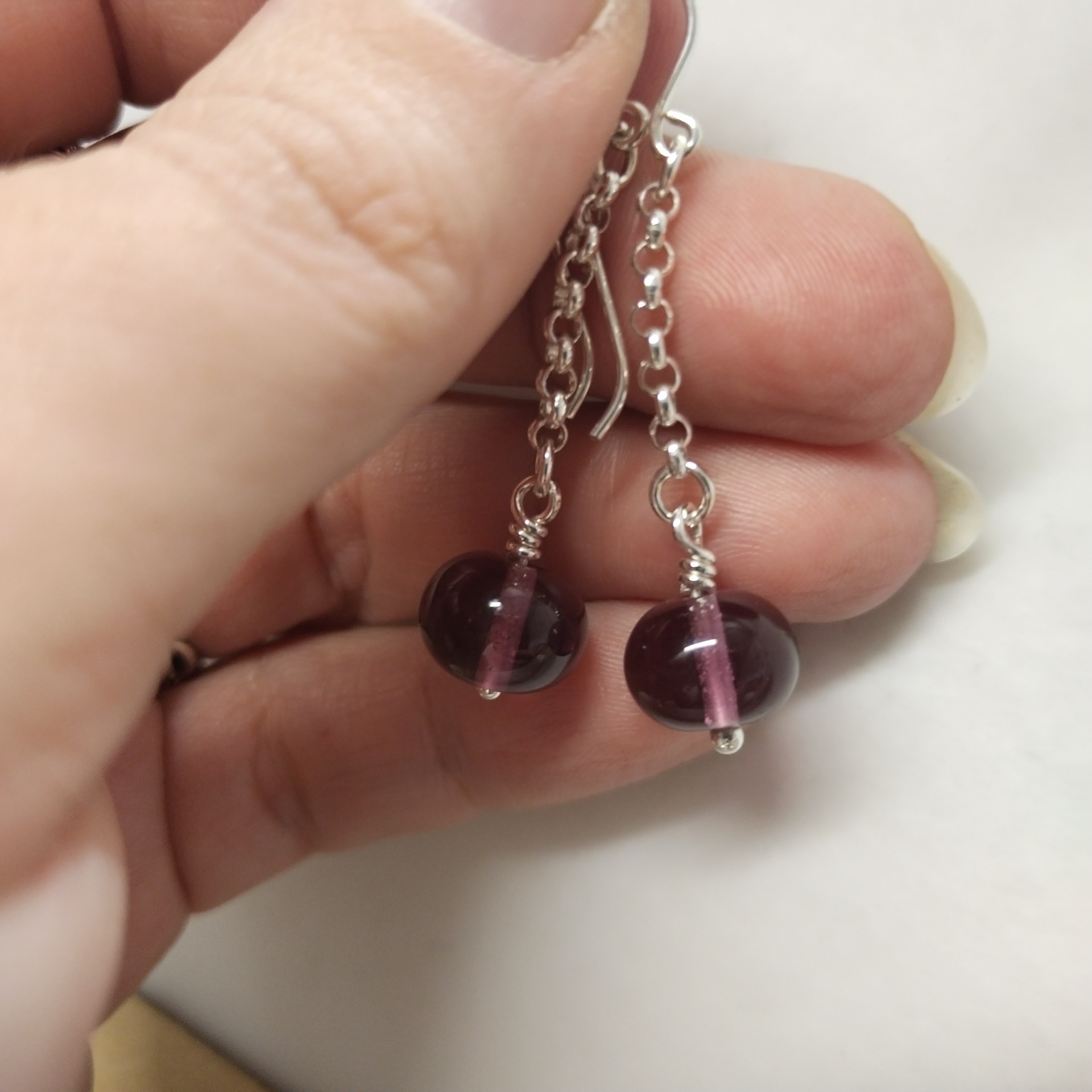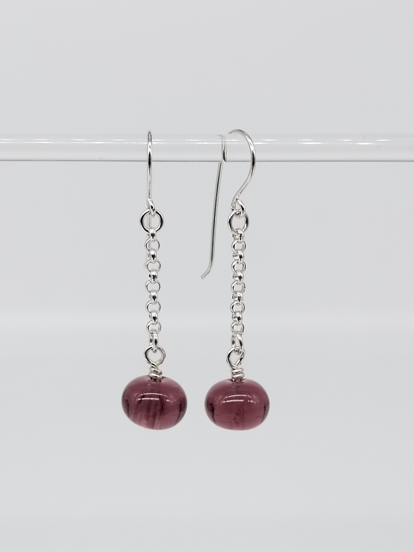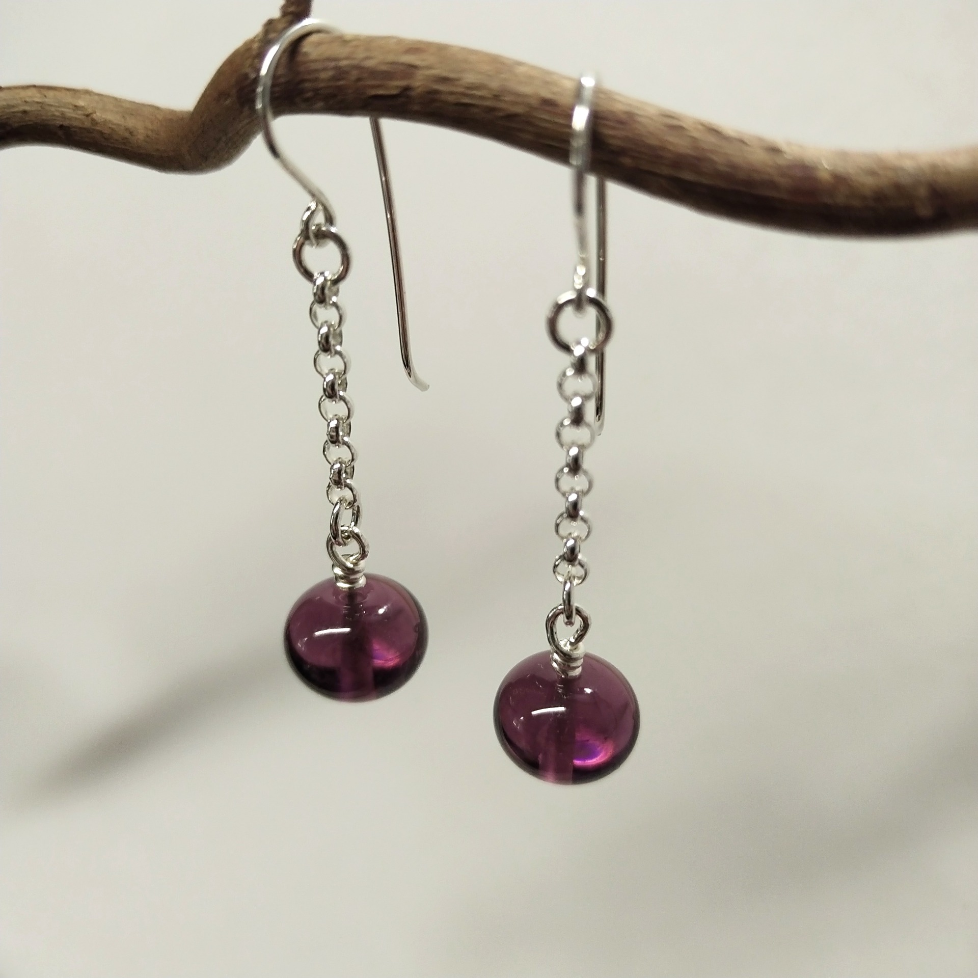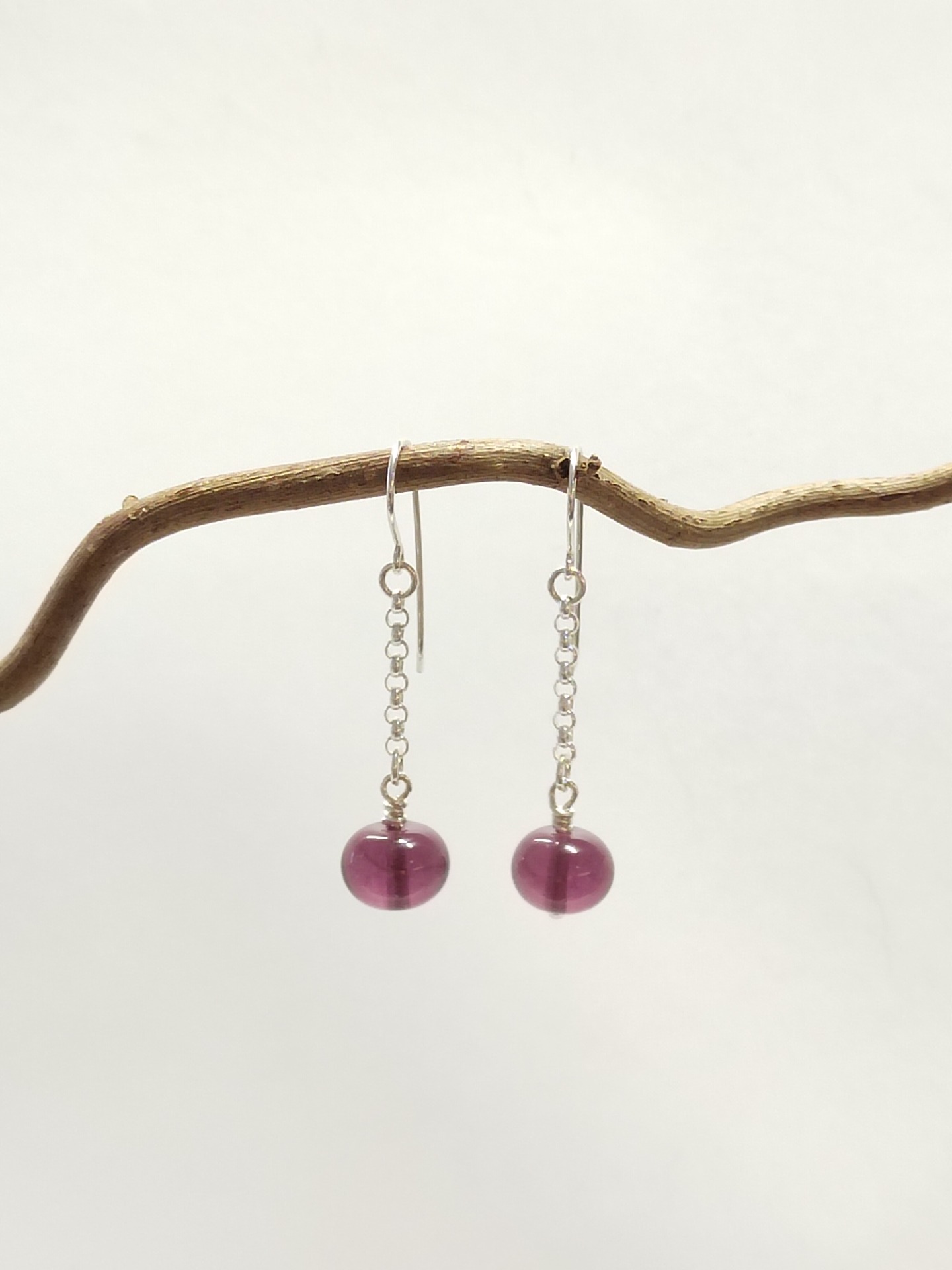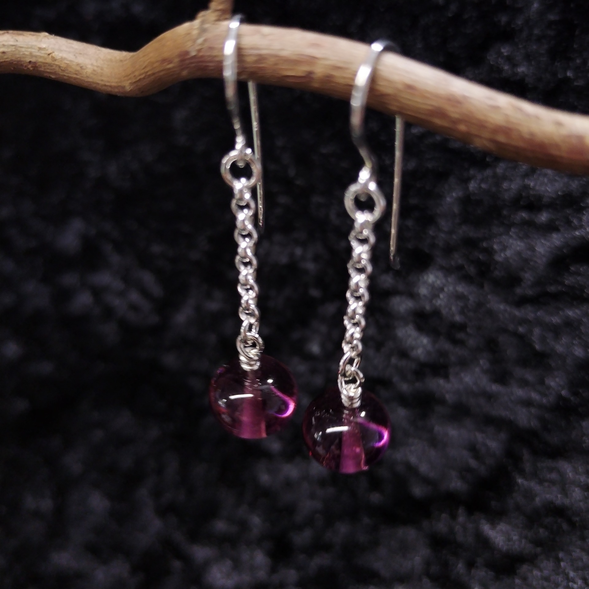 Purppuran sävyinen meri – lämmin, pehmeä ja syvä. Näiden korvakorujen lasi on kuin iltataivaan viimeinen hehku ennen pimeää: rauhallinen mutta voimakas.
