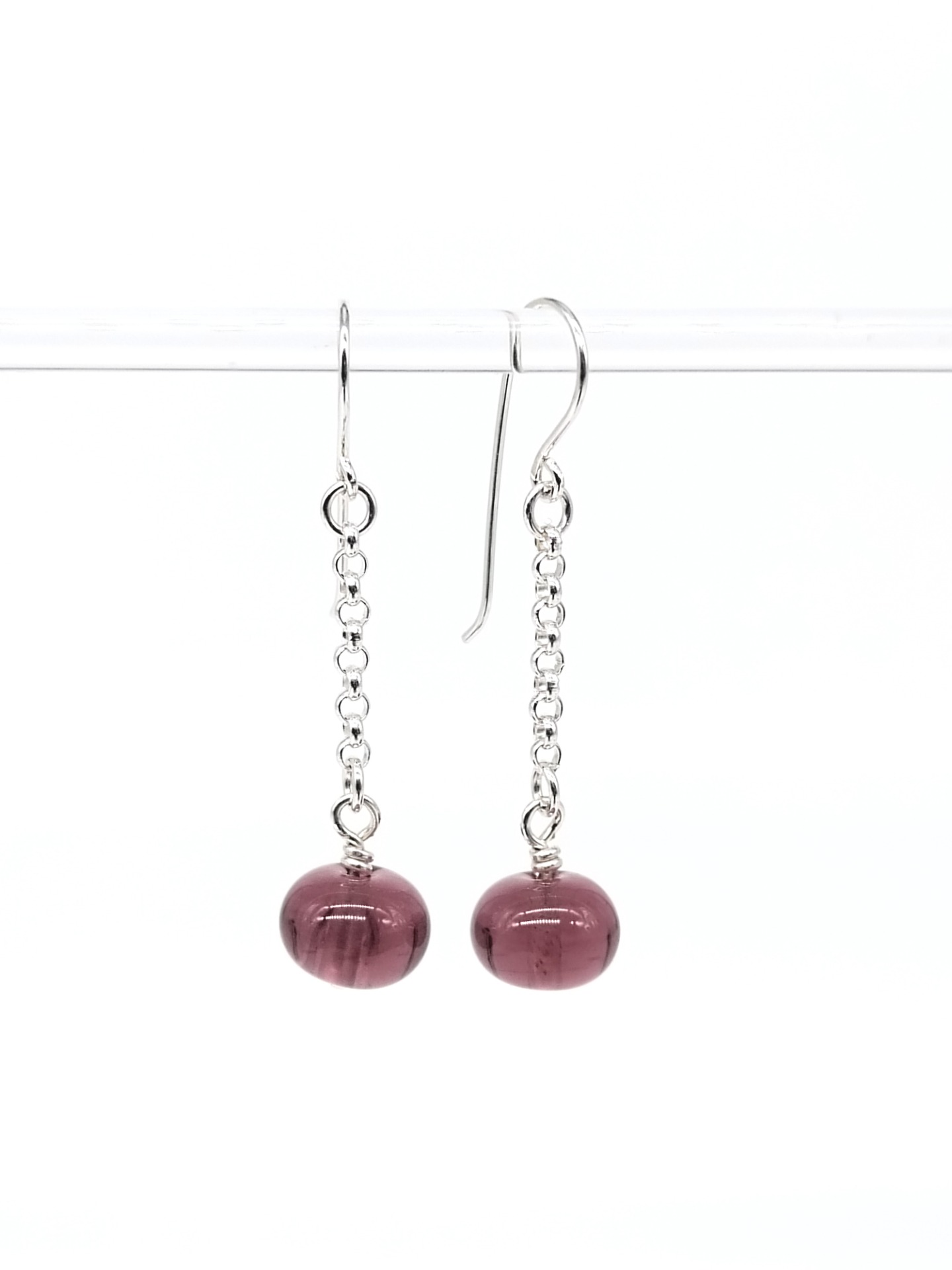 Purppuran sävyinen meri – lämmin, pehmeä ja syvä. Näiden korvakorujen lasi on kuin iltataivaan viimeinen hehku ennen pimeää: rauhallinen mutta voimakas.