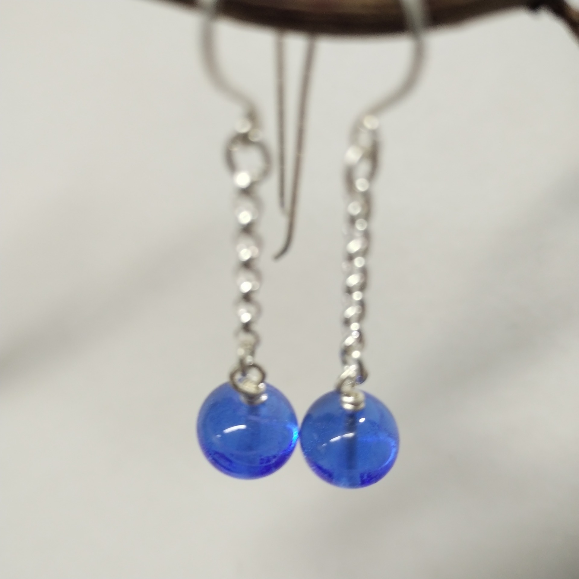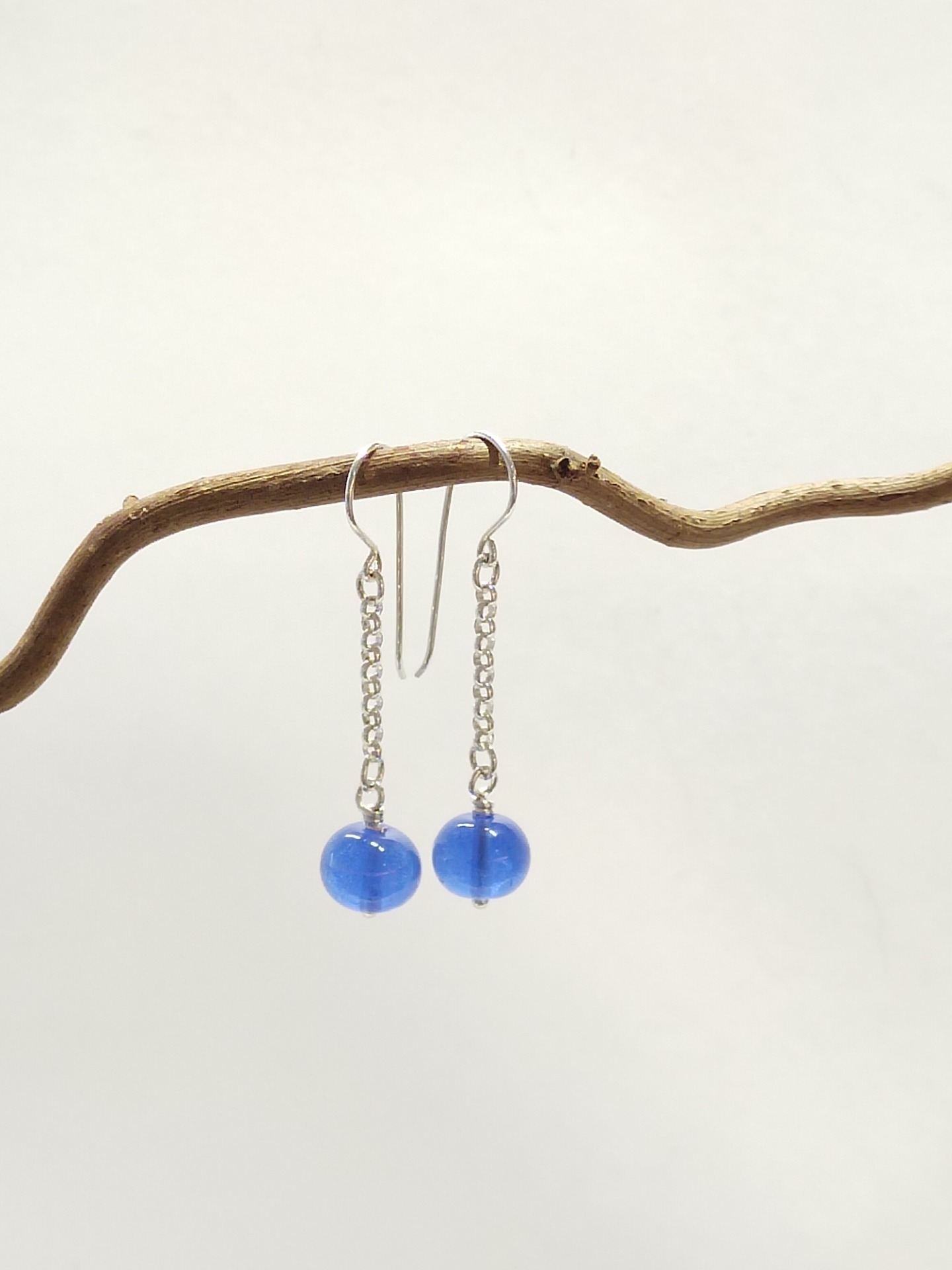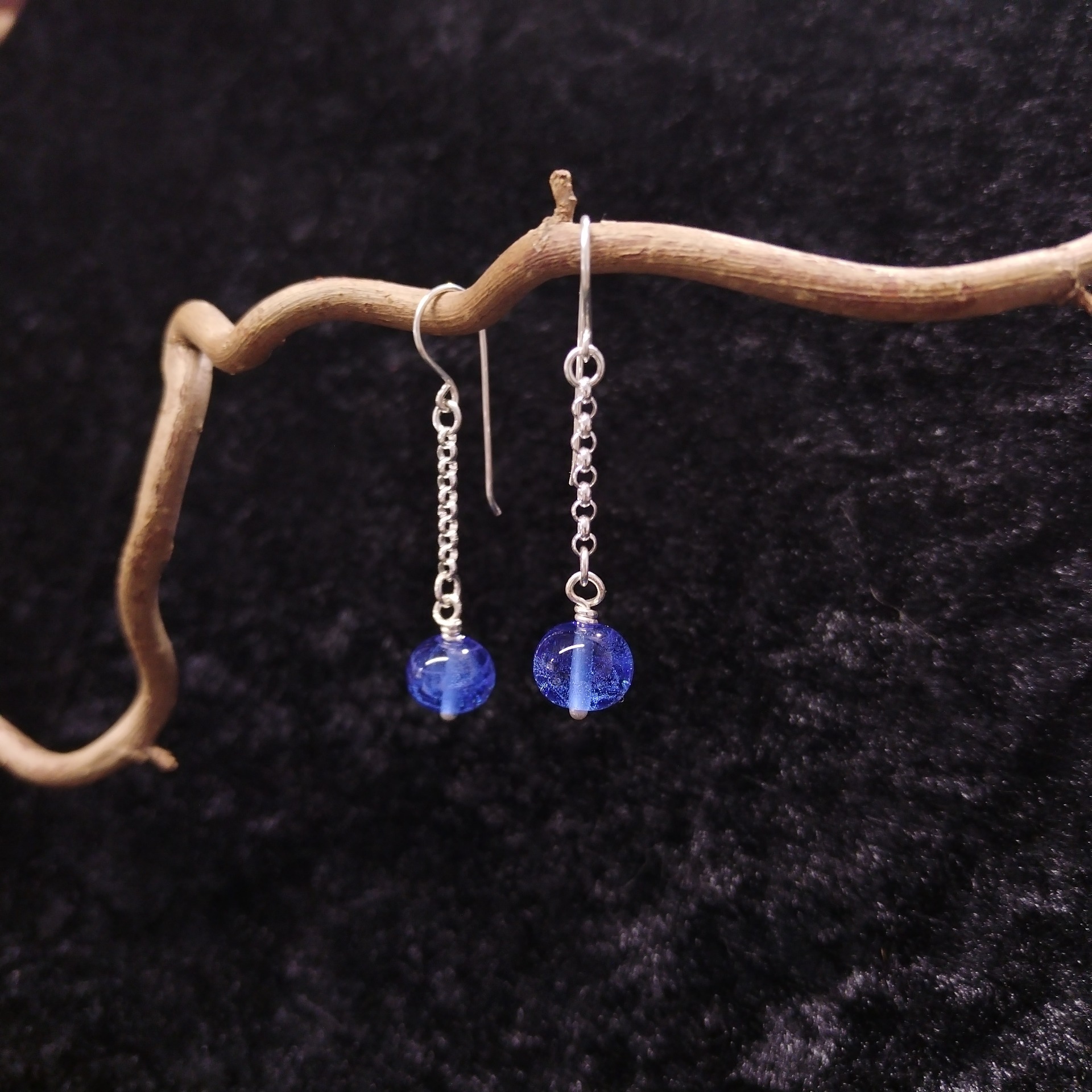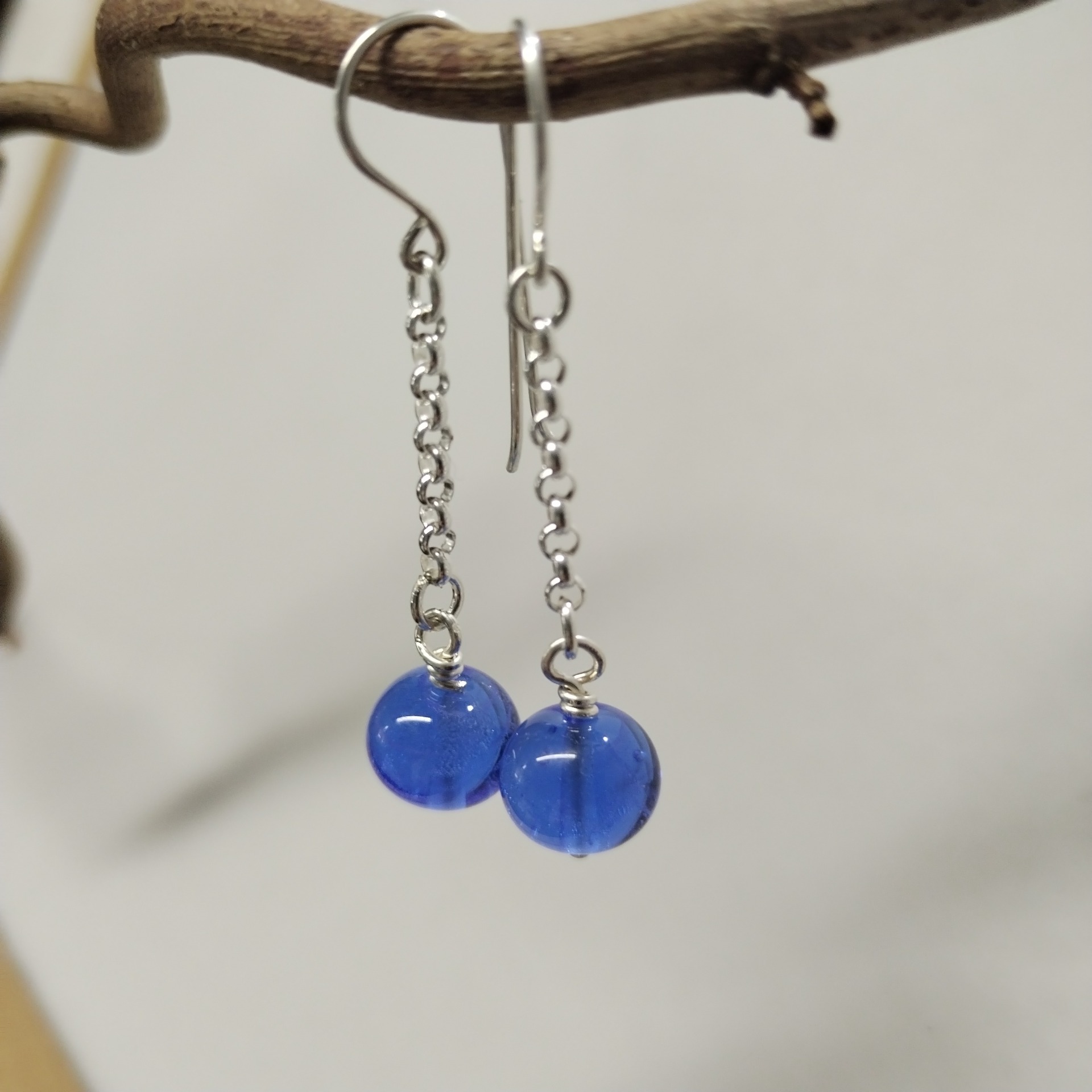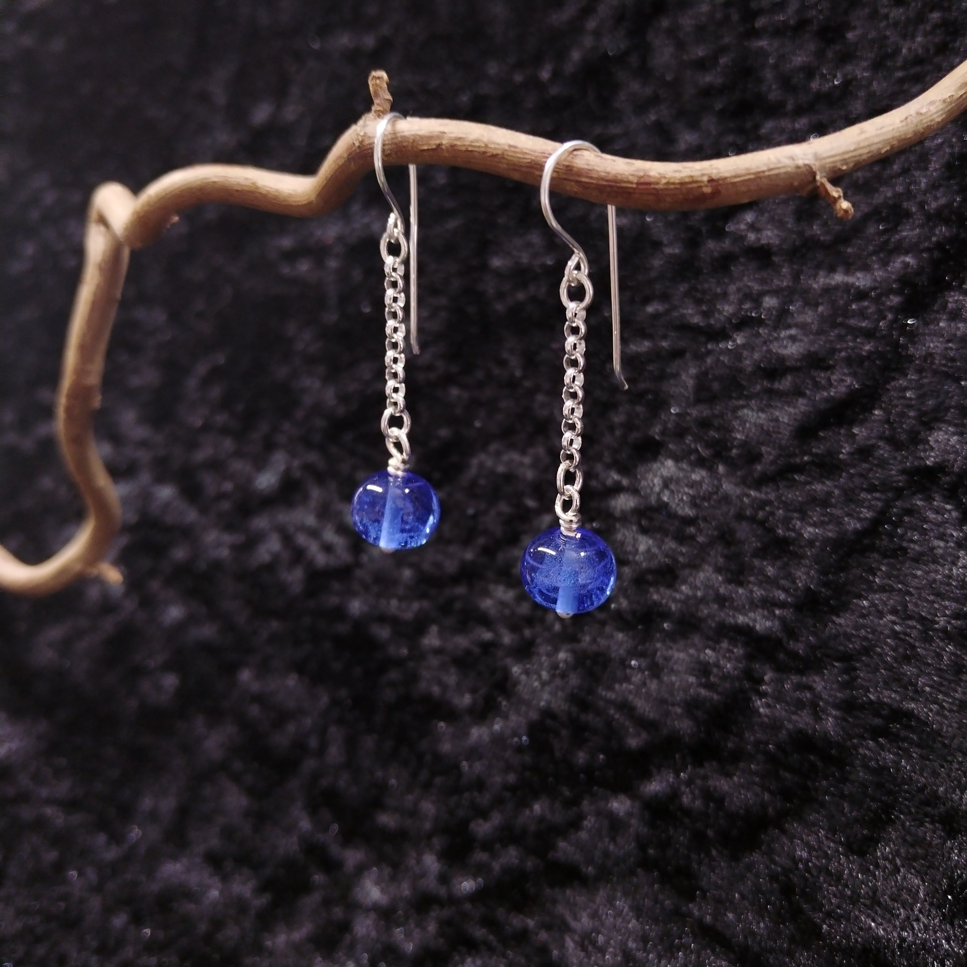 Syvänsiniset lasihelmet veivät ajatukset heti meren syvyyksiin – sieltä ajatus tähän koruun sai alkunsa. Jokainen helmi on sulatettu käsin, ja sen sisään on jäänyt pieni häivähdys valoa, kuin aaltojen väliin kätketty hehku.