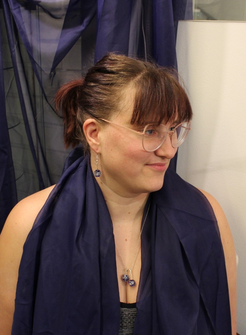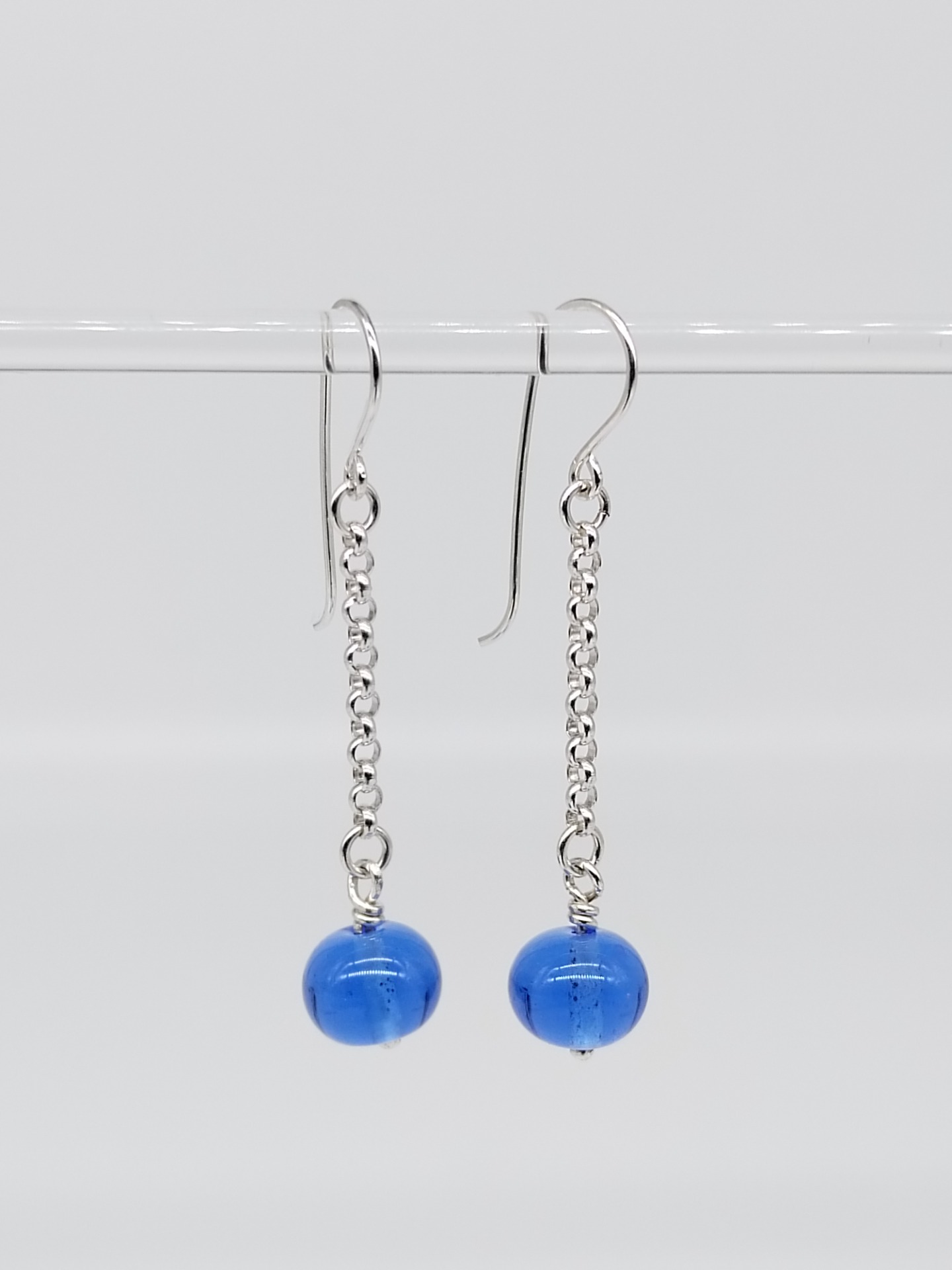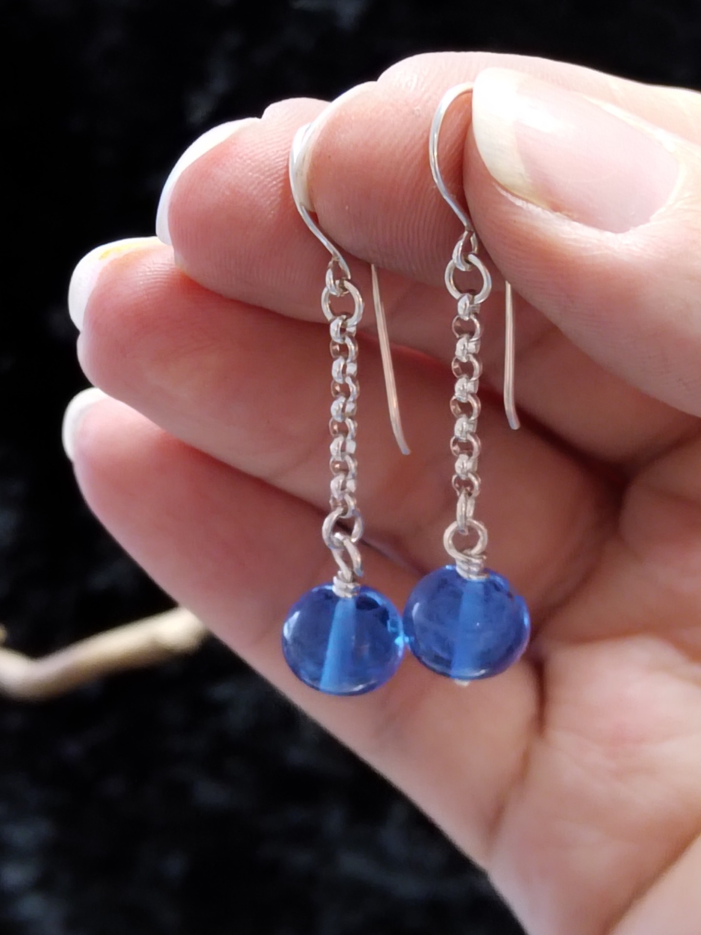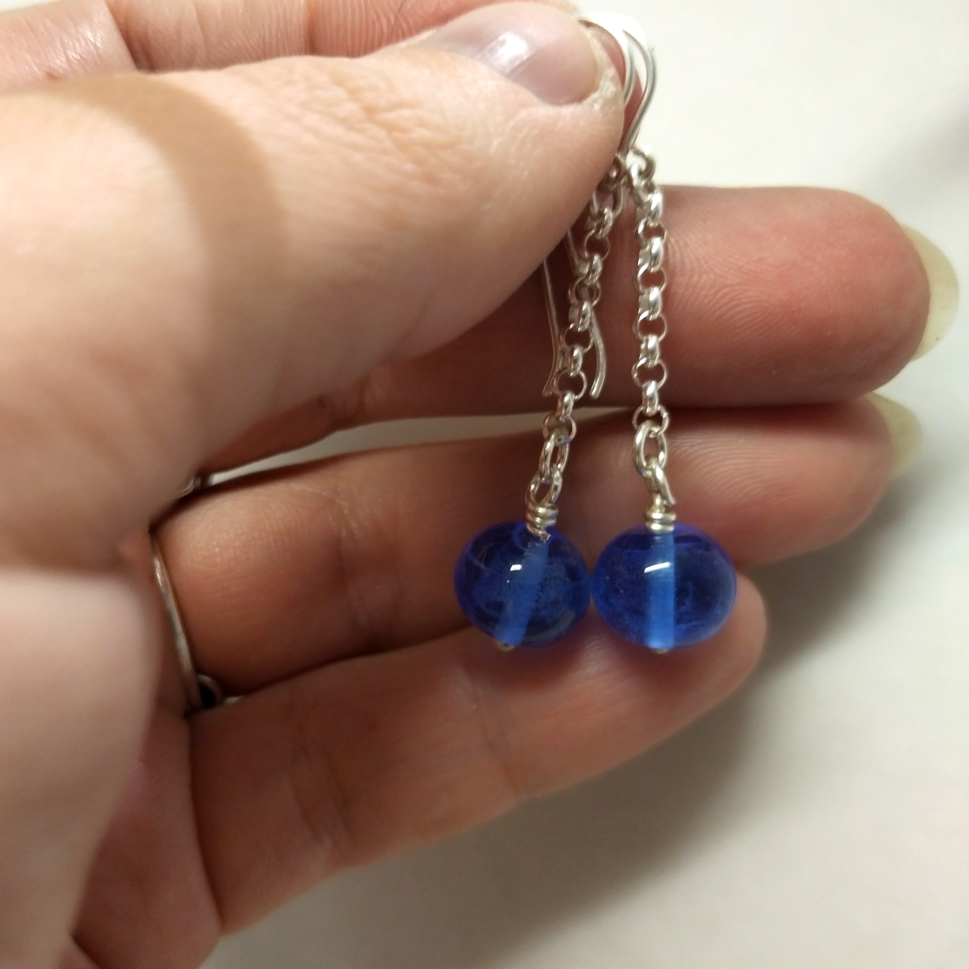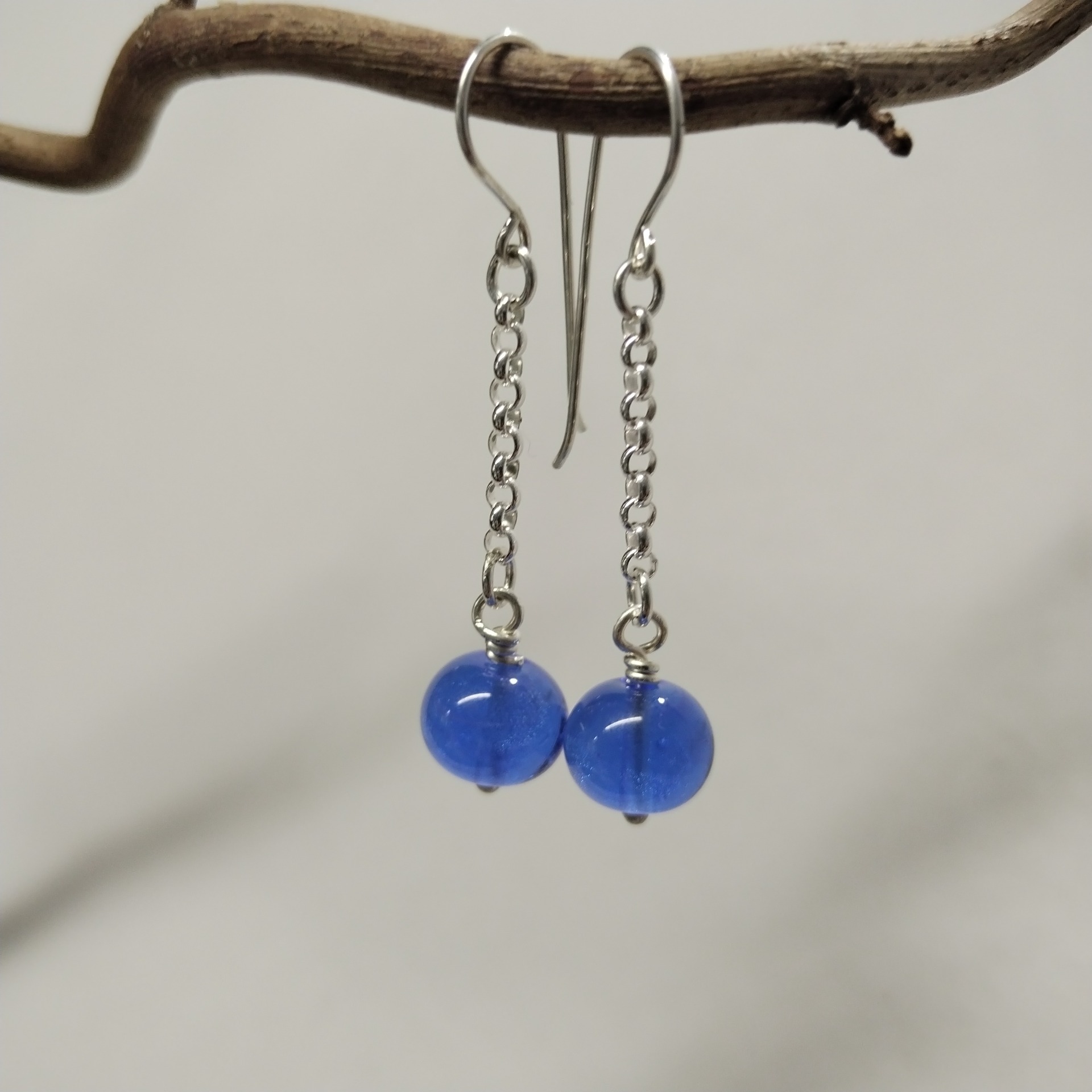 Syvänsiniset lasihelmet veivät ajatukset heti meren syvyyksiin – sieltä ajatus tähän koruun sai alkunsa. Jokainen helmi on sulatettu käsin, ja sen sisään on jäänyt pieni häivähdys valoa, kuin aaltojen väliin kätketty hehku.