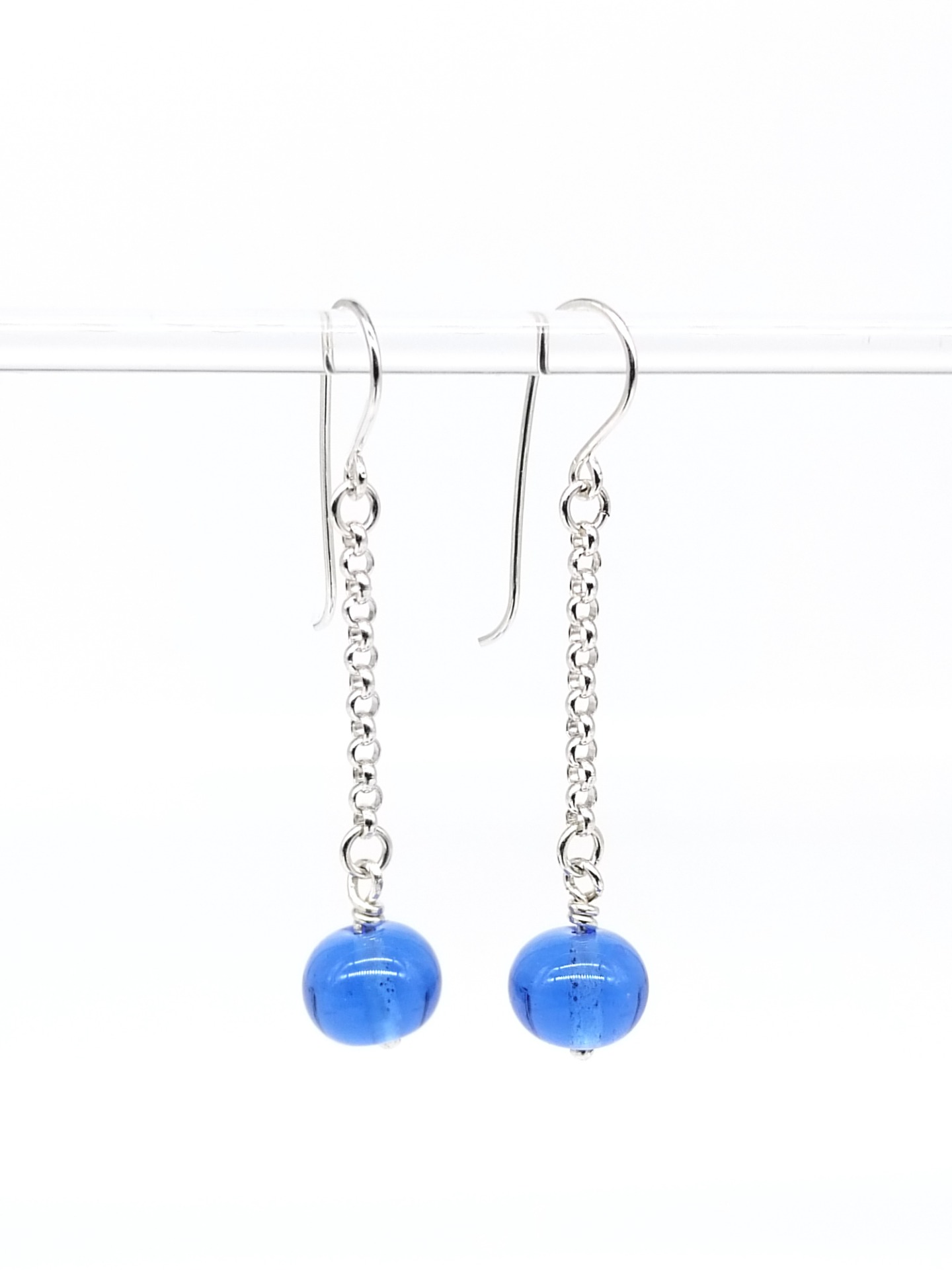 Syvänsiniset lasihelmet veivät ajatukset heti meren syvyyksiin – sieltä ajatus tähän koruun sai alkunsa. Jokainen helmi on sulatettu käsin, ja sen sisään on jäänyt pieni häivähdys valoa, kuin aaltojen väliin kätketty hehku.