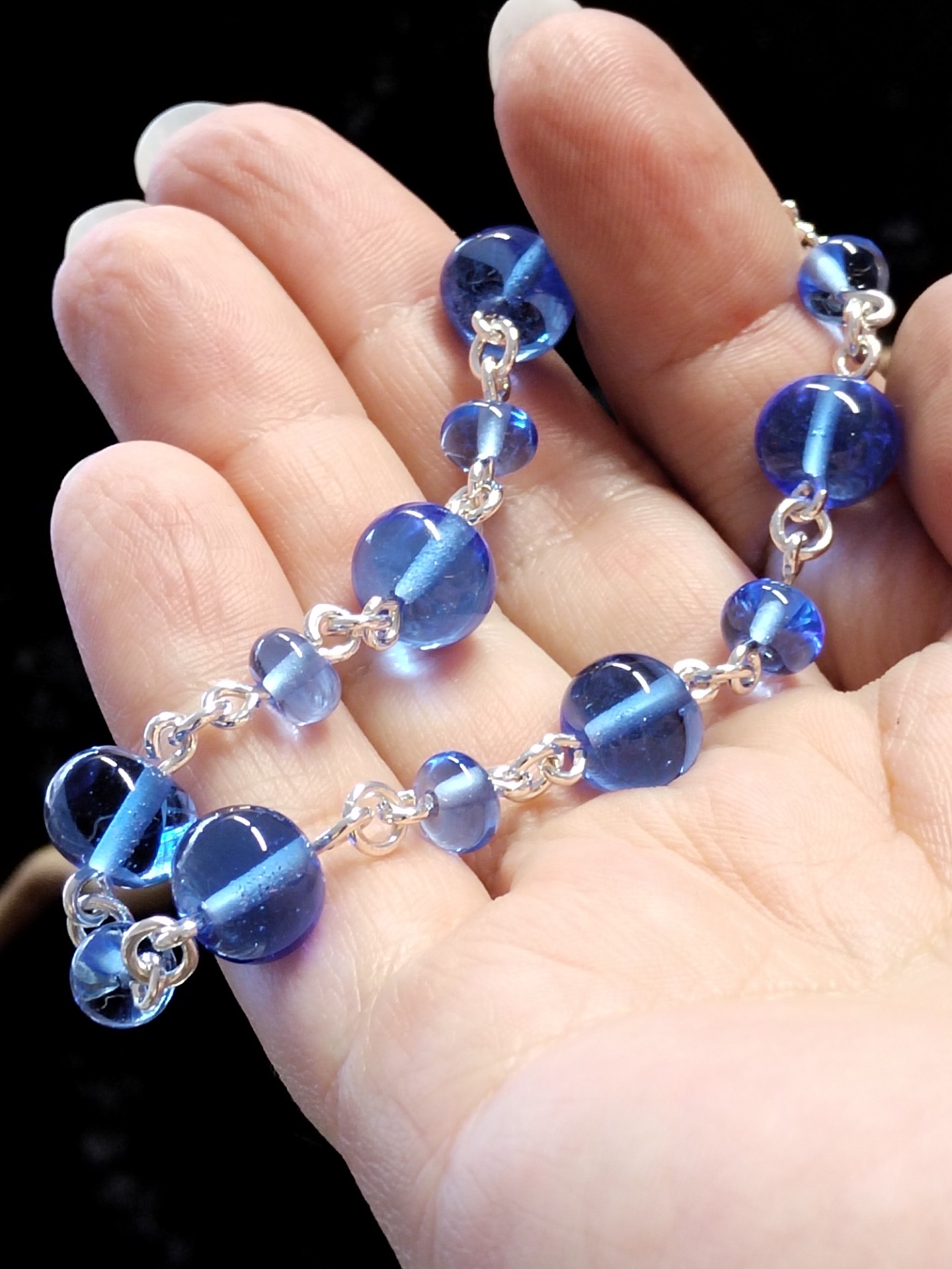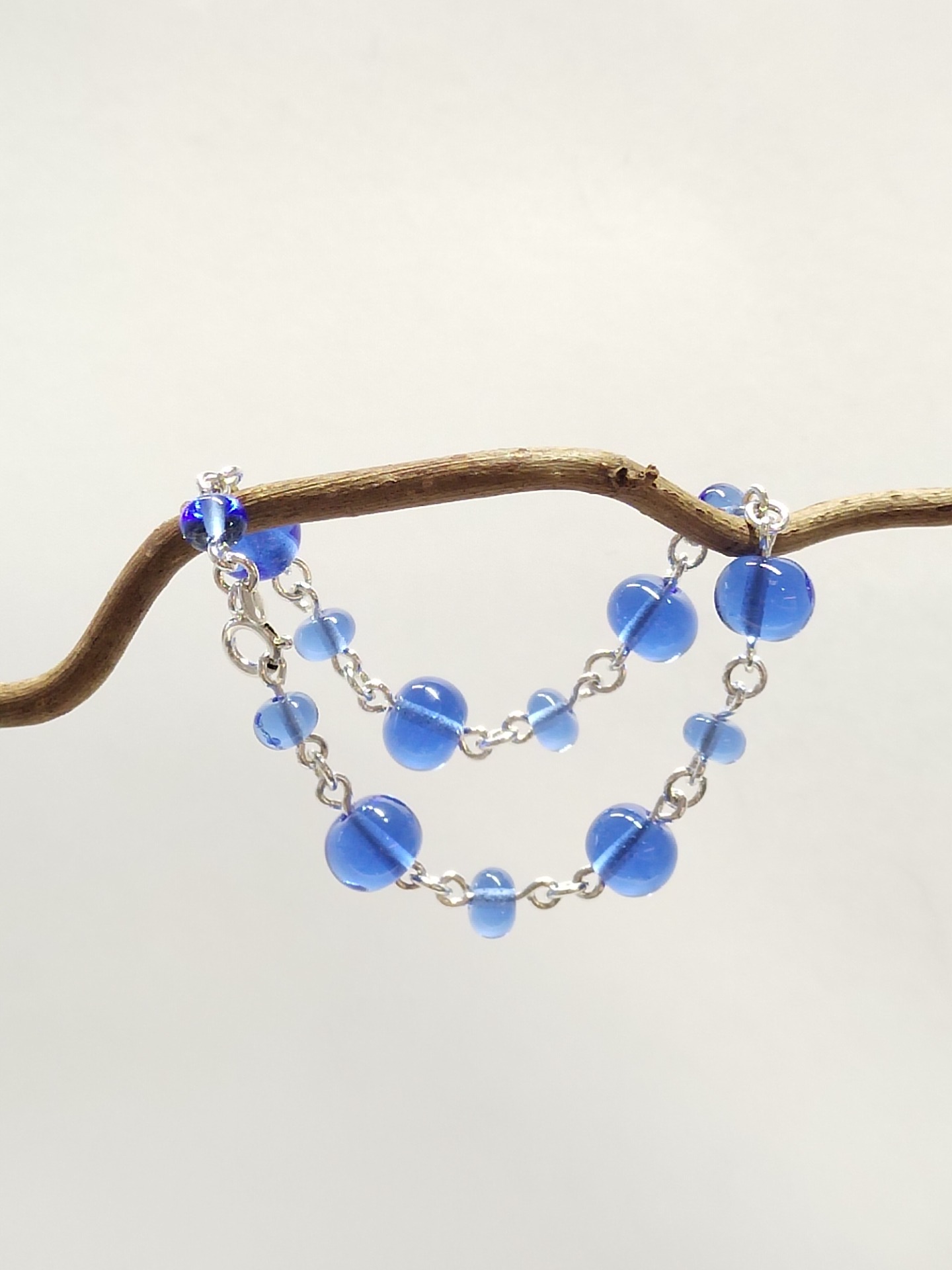 Käsin muotoillut lasihelmet, jokainen helmi on ainutlaatuinen. Ketju on valmistettu hopeasta.